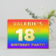 The front of this eye-catching and upbeat eighteenth birthday party/celebration foil invitation card design features an editable name, a large number “18th”, the message “BIRTHDAY PARTY!”, and a border. The background of the front has a joyful, multicolored, rainbow spectrum inspired gradient pattern. The back features personalised details about the event, such as the date, time, venue/place, and any other relevant information. Personalised invitations like these might be a fun way to invite guests/attendees to a birthday gathering/party being held to celebrate somebody’s 18th birthday. [~Z0000599]