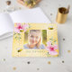 For a 18th summer birthday party. Yellow, white background with a honeycomb pattern. Decorated with pink coloured tropical florals flowers, hibiscus and happy bumble bees. Add your own photo and the age 18. Green coloured letters.