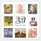 A sticker for a 18th birthday party for a boy, celebrating his life with a collage of 8 of your photos. Templates for the age 18 and a date. Date of birth or the date of the party. Black coloured letters. White background.