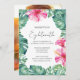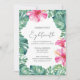 Celebrate your 18th birthday in style with these modern tropical invitations, featuring vibrant fuchsia pink hibiscus flowers and watercolor monstera palm leaves.