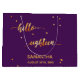 Elegant and modern for a 18th birthday party. Girly purple backdrop and faux gold text written with a trendy hand-lettered style script: hello eighteen. With golden dots as decor. Templates for name and date, golden letters.