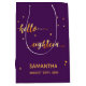 Elegant and modern for a 18th birthday party. Girly purple backdrop and faux gold text written with a trendy hand-lettered style script: hello eighteen. With golden dots as decor. Templates for name and date, golden letters.