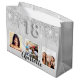 A gift bag for a girly and glamourous 18th birthday. A silver looking background with glitter. Personalise and add 3 photos and a name. Number 18 is written with a balloon style font. Perfect as a party favour bag or as a gift bag.
