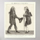 Engraved at the bottom are their imagined words. Delacroix, standing ‘chapeau-bras’ and holding a cane, says “Bon jour Mylord! Je suis charmé de vous voir à Paris, comment vous portez-vous?” (Good Day, Mylord. Charmed to see you in Paris, how are you?) Malmesbury responds. “Je vous suis obligé de votre gracieuse demande, mais ne pouvant répondre de moi-même, je vais dépêcher un courier a Londres; et à son retour, je saurai la réponse que je dois vous faire.” (I am much obliged for your gracious enquiry, but unable to respond for myself, I must send a dispatch to London, and when it comes back, I will know what I should say to you.”