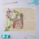 Beautiful collaged ephemera of 18th century Lady in a pink dress against a vintage garden manual background.
