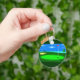 Keychaindepicting a digital illustration of the 18th hole on a golf course with a cloudy blue sky, lake, trees, sand trap and the golf ball sitting on the green, inches away from the cup waiting to be putted in.