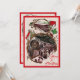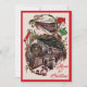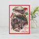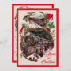 This Christmas Party invitation shows an early 1900s image of people gathering in the station and riding an old-fashioned train home for the Christmas holidays. With red, white, and green flags for festive holiday decorations.