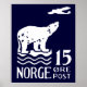 The 1925 Norwegian 15 Ore Air Mail postage stamp. The stamp features a Polar Bear on an ice sheet watching an aeroplane delivering mail. This design is available in dark blue, white and a light blue.