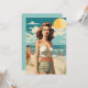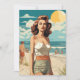 The image is a vibrant pop art-style poster depicting a 1950s summer beach scene. A confident woman with voluminous wavy hair, wearing a stylish white and orange swimsuit, stands prominently in the foreground. In the background, other beachgoers are enjoying various activities along the shoreline, with a bright sun shining in a blue sky dotted with clouds. The overall aesthetic combines retro fashion with a lively, nostalgic atmosphere.