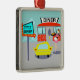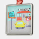 Serve up something special with this 1950's Diner Christmas Ornament. The cartoon drawing design features a red brick building with blue windows, grey double doors, and a white sign that says, "Diner" perched on the roof. In the parking lot, a second sign is on a pole. The sign has a turquoise background and a flashing red arrow pointing the way to, "Don's Diner." The sign has done its job because there is a bright yellow car with fins parked next to it. Even though we can't see them, the passengers of the car must be smacking their lips. A cute, young carhop is rollerskating her way to the car. Her brunette hair is in a bouncy ponytail. She is wearing a short, pink uniform with black trim and a white apron. Balanced on one hand, the carhop is carrying a black tray holding a giant hamburger and a refreshing, old-fashioned, glass bottle of soda. The background behind the diner is teal with light blue clouds and the silhouettes of cedar trees.