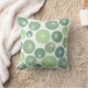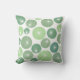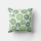 This throw pillow has a mid-century modern design of circles in shades of 1950s green with white starbursts in them, all on a field of white.