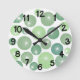 This wall clock has a mid-century modern design of circles in shades of 1950s green with white starbursts in them, all on a field of white.