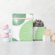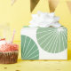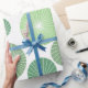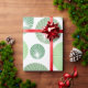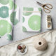 This wrapping paper has a mid-century modern design of circles in shades of 1950s green with white starbursts in them, all on a field of white.
