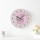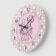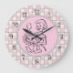 Retro wall clocks with printed pink and white 1950 style ceramic tiles pattern background and retro housewife with her turkey dinner on the clock face in this decorative wall decor design for your kitchen, dining room, or any room in your house you want to add some colour and character. Colours include pink, black and white.