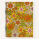 This notebook features a retro floral pattern, which was inspired by designs from the 1960s and 1970s, with flowers in shades of orange, yellow, pink, and olive green on a green background