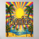 Great quality poster featuring 1960's style Florida design with orange trees, palm trees, seashore and sun. Letters are filled with psychedelic 60's designs.