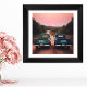 1960s trucks on a red dirt road together through green woods on either side with a pink sky sunset in the distance. The left truck is kelly green, the right is royal blue. Add custom names to the tailgates using our template!