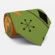 This necktie has a mid-century modern 1970s design of diamonds, and starbursts on a field of green.