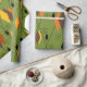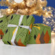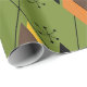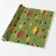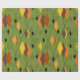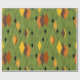 This wrapping paper has a mid-century modern 1970s design of diamonds, and starbursts on a field of green.