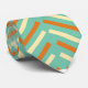 This tie has a 1970s chevron design in retro orange and white on a field of blue.