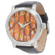 This watch design has two layers of ovals on a field of yellow, brown, and orange.