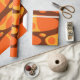 This wrapping paper design has two layers of ovals on a field of yellow, brown, and orange.