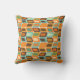 This throw pillow has a mid-century modern design of rounded rectangles leaning to the side with leaning rectangles inside made from lines all in 1970s colours.