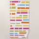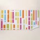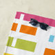 This beach towel has a mid-century modern design of vertical lines in 1970s orange, brown, green, and blue on a field of white with horizontal white lines crossing them.