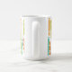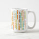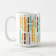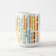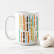 This mug has a mid-century modern design of vertical lines in 1970s orange, brown, green, and blue on a field of white with horizontal white lines crossing them.