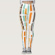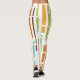 These leggings have a mid-century modern design of vertical lines in 1970s orange, brown, green, and blue on a field of white with horizontal white lines crossing them.