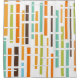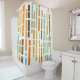 This shower curtain has a mid-century modern design of vertical lines in 1970s orange, brown, green, and blue on a field of white with horizontal white lines crossing them.