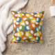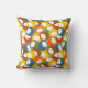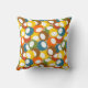 This throw pillow has mid-century modern design of circles in blue, green, brown, sienna, yellow, and orange with white ovals inside.