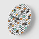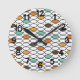 This wall clock has a 1970s retro design of ovals in white, brown, blue, and two shades of orange.
