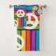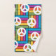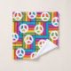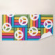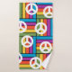 This towel set has a design of squares formed by rectangles in blue, purple, orange, yellow, and green with peace signs scatter on top.