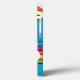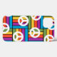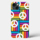 This phone case has a design of squares made of rectangles in bright 1970s colors with peace signs scatter around it.