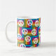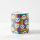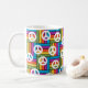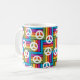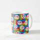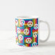 This mug has a design of squares made of rectangles in bright 1970s colors with peace signs scatter around it.