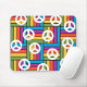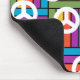 This mouse pad has a design of squares made of rectangles in bright 1970s colours with peace signs scatter around it.