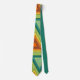 This necktie has a 1970s design on concentric triangles in shades of teal, orange, yellow, purple, and pink on a field of green.