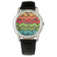 This watch has a 1970s design of zigzag lines in yellow, orange, red, green, and blue on a field of brown.