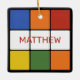 This simple geometric design of square in bright primary colours of orange, blue, red, green, yellow and white set against a black background has a retro 1980s feel. Add your own name or other text to create a personalised Christmas tree ornament.