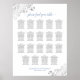 This beautiful wedding seating chart features table assignments for 190 guests, with 10 people at each table. The design is simple yet elegant with dark grey and light blue text on a white background. There are lacy silver faux foil curls and swirls in the corners and fancy script calligraphy reading "please find your table."