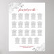 This beautiful wedding seating chart features table assignments for 190 guests, with 10 people at each table. The design is simple yet elegant with dark grey and red text on a white background. There are lacy silver faux foil curls and swirls in the corners and fancy script calligraphy reading "please find your table."