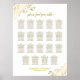 This beautiful wedding seating chart features table assignments for 190 guests, with 10 people at each table. The design is simple yet elegant with gold text on a white background. There are lacy gold faux foil curls and swirls in the corners and fancy script calligraphy reading "please find your table."