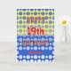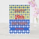 Happy birthday to a 19 year old! Add their name on the front and personalize the greeting inside. The front has the text in bright red and white, with a background of gradient blue circles on a blue and yellow block background. Inside, the background is a similar pattern of repeating circles. The customizable message is "It's time to celebrate Have fun and eat cake. This day is special And so are you! HAPPY BIRTHDAY"