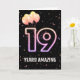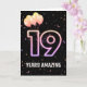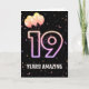 Party balloons and confetti on black background with the neon number 19 for 19th birthday.
