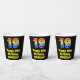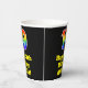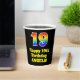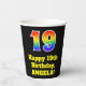 This exciting and fun birthday themed paper cup design features a large number “19” with a rainbow spectrum gradient inspired pattern, along with the message “Happy 19th Birthday,”, and a custom name. The background is coloured black. Vibrant, colourful paper cups like this might be fun to use at a birthday celebration being held to honour somebody’s 19th birthday. [~Z0000537]