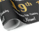 This sophisticated, elegant, and luxurious birthday-themed wrapping paper design features a large ordinal number “19th” having a faux/imitation gold-inspired gradient pattern, plus the birthday greeting message “Happy 19th Birthday,” and a custom recipient name in a script-style font. The background is coloured black. Birthday themed wrapping paper like this might be a fun way to wrap a gift or present being given to somebody who is celebrating their nineteenth birthday. [~Z0000515]