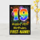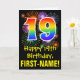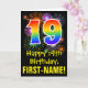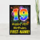 The front of this fun, exciting, and colorful birthday greeting card design features a large number "19" with a rainbow spectrum gradient inspired pattern, along with the message "Happy 19th Birthday,", and a customizable recipient name. The front additionally features a colorful bursting celebratory fireworks inspired background pattern. The inside features a personalized birthday greeting message, or could perhaps be cleared and left blank if a message is to be written by hand instead. A customizable birthday card like this might be a fun way to send a message in celebration of somebody’s nineteenth birthday. [~Z0000442]