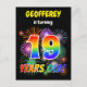 The front of this fun and exciting birthday party invitation postcard design features a customisable name, a vibrant bursting celebratory fireworks inspired pattern, and the message "19 YEARS OLD!" having a colourful rainbow spectrum inspired gradient pattern. The back features an editable message with information about the party, such as when and where it is being held. Invitation postcards like this might be sent to potential attendees of a birthday party being held to celebrate somebody’s nineteenth birthday. [~Z0000452]
