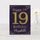 Happy Birthday with simulated golden glitter number 19 set on a solid colour and framed by faux diamonds and rhinestones. Happy birthday and recipients name in off-white font. Personalise with name or message.